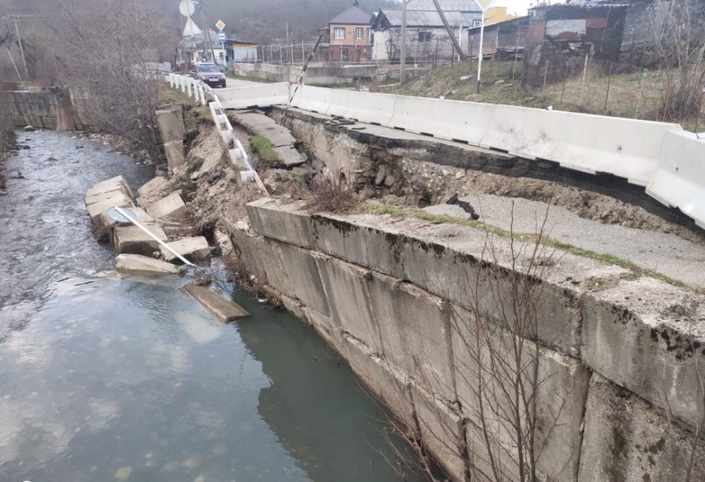 Обильные осадки и подъем уровня воды в реке привели к подмыву опорной стены дороги краевого значения к аулу Большое Псеушхо.