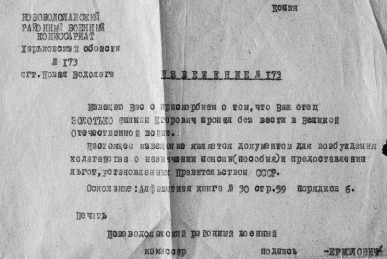 Лист тонкой, словно папиросной, бумаги хранится в семейном фотоальбоме. Это — извещение о без вести пропавшем солдате Филиппе Егоровиче Золотько. Документ, который получили его двое малолетних детей — сын и дочь, уже оставшиеся без матери. Извещение мы, потомки, нашли случайно, когда перебирали семейные архивы. Так уж вышло — в год 70-летия Победы.