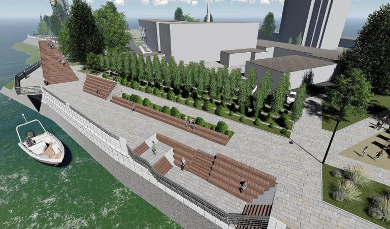 На первом этапе демонтируют устаревшие конструкции, затем уложат новое тротуарное покрытие, установят ограждение, бетонные лестницы и колоннады, озеленят территорию.