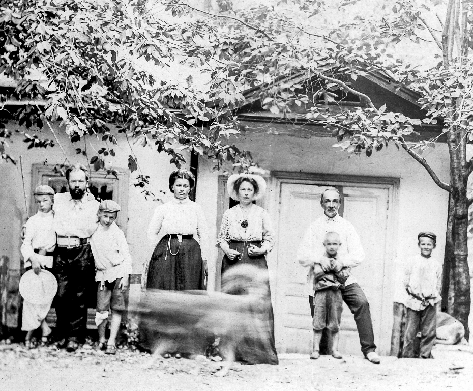 На фото: Сергей Богословский с сыновьями Сашей и Мишей, Олимпиада Александровна, супруга (стоит в центре).