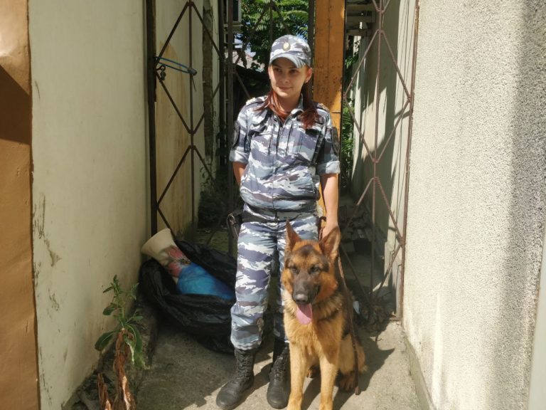 На проверку подозрительного предмета прибыла младший инспектор-кинолог отдела МВД России по Туапсинскому району Анаида Калайджян вместе с немецкой овчаркой Графом, обученному поиску взрывчатых веществ.