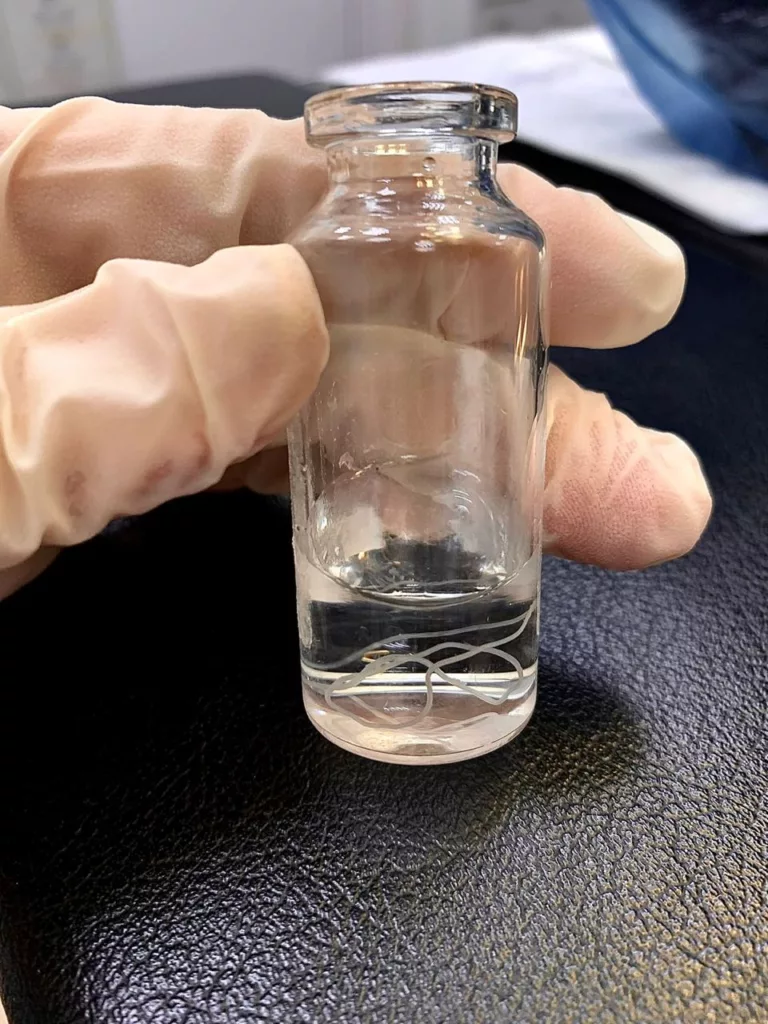 После того, как воспаление вскрыли, извлекли червя Dirofilaria repens. Этими паразитами человек может заразиться через укус комаров.