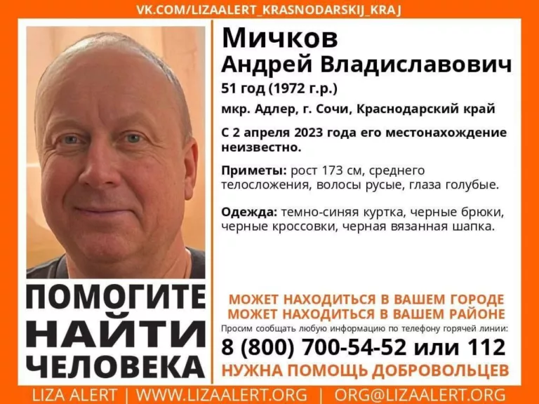 Перед исчезновением Андрей Мичков был одет в темно-синюю куртку, черные брюки, кроссовки и шапку.