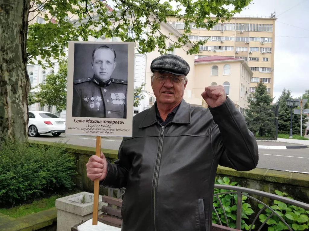 Юрий Гуров педагог из Москвы, в последнее время живёт в Туапсе. В его руках портрет отца — гвардии майора, командира артиллерийской батареи, десантника второго украинского фронта Михаила Гурова.