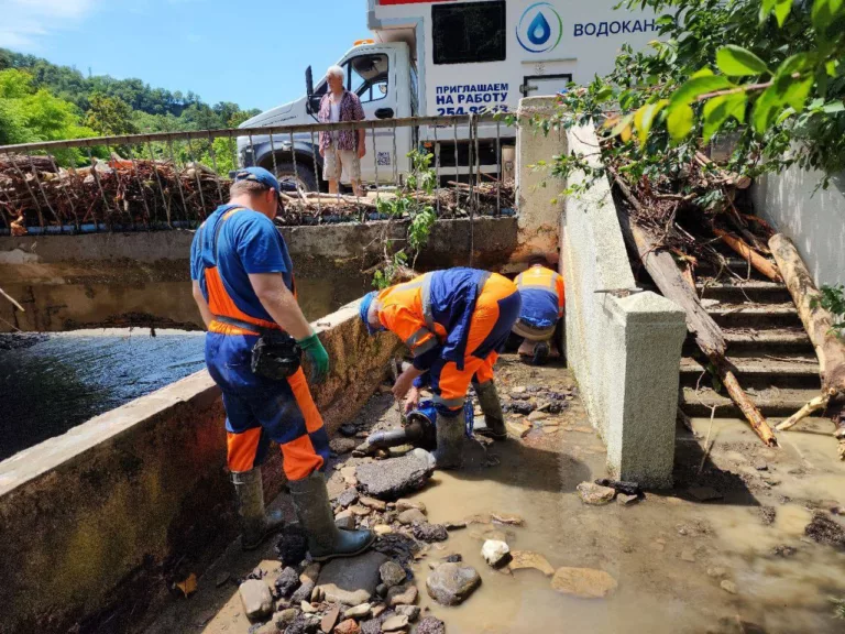 Вчерашний паводок, вызванный залповыми ливнями, не только снёс деревья и автомобили, но и повредил водопроводные трубы в сочинской Мацесте.