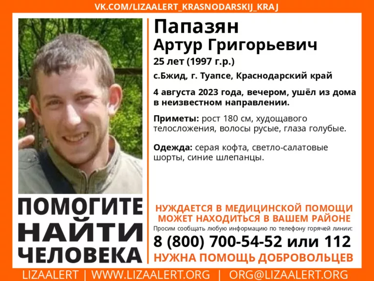 Если вам что-либо известно о месте нахождения Артура Папазяна, просьба сообщить по телефону горячей линии поискового отряда “Лиза Алерт” 8-800-700-54-52 или 112.