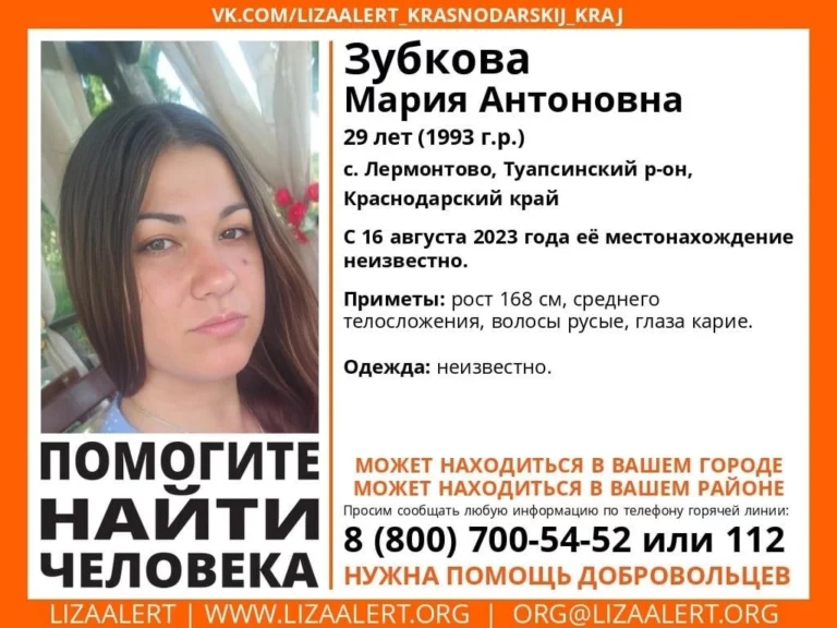 Если вы что-либо знаете о том, где может находиться Мария Зубкова, просьба сообщить по телефону горячей линии поискового отряда “Лиза Алерт” 8-800-700-54-52 или 112.