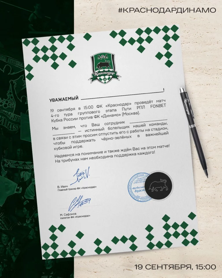Но если финт не прокатит, то “быки” предлагают передать начальнику официальное письмо-предложение на игру. Скачать его можно в официальном телеграм-канале клуба.