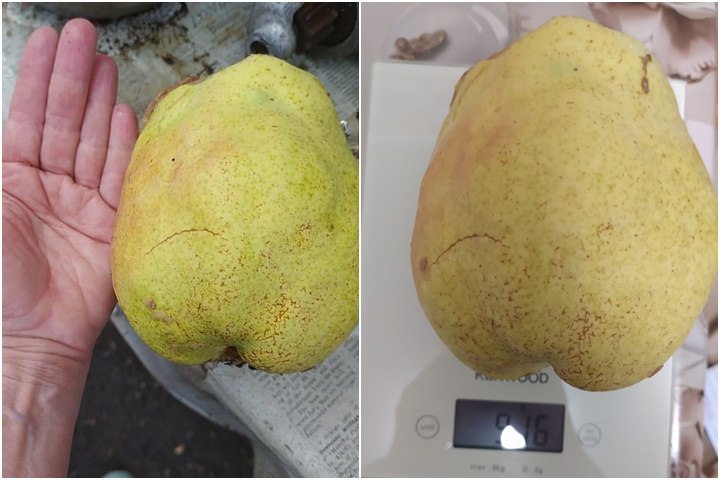 На снимке видно, что фрукт действительно сильно отличается от стандартных плодов. По размеру груша выросла больше ладони, а вес фрукта составил 916 граммов.