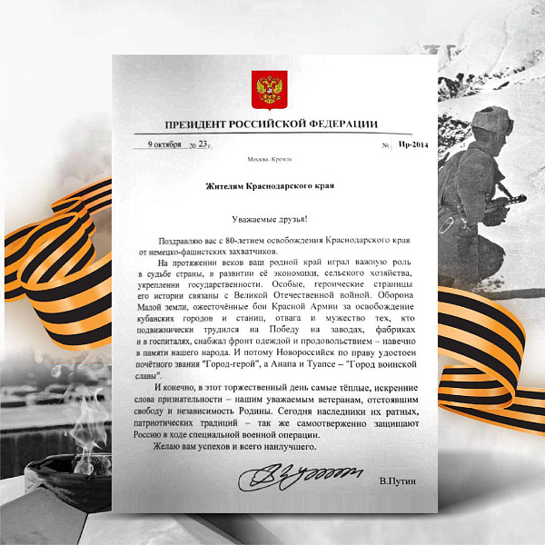 В своем поздравлении Владимир Путин отметил, что Кубань всегда играла важную роль в судьбе страны, развитии ее экономики, сельского хозяйства, укреплении государственности. В памяти народа навечно вписаны героические страницы истории края, связанные с Великой Отечественной войной.
