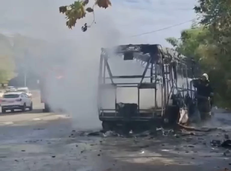 Это произошло в Дагомысе на остановке «Нижняя Шаумяновка». Сообщают, что автобус загорелся во время движения. Пожарные приехали быстро и потушили то, что осталось. Причины возгорания устанавливают.
