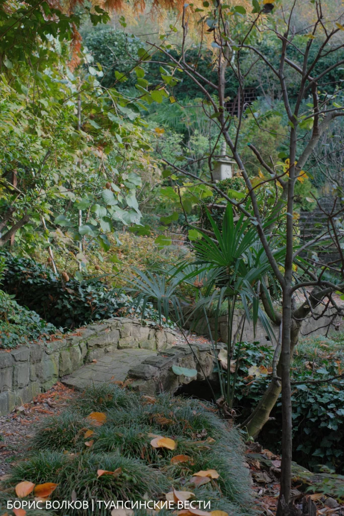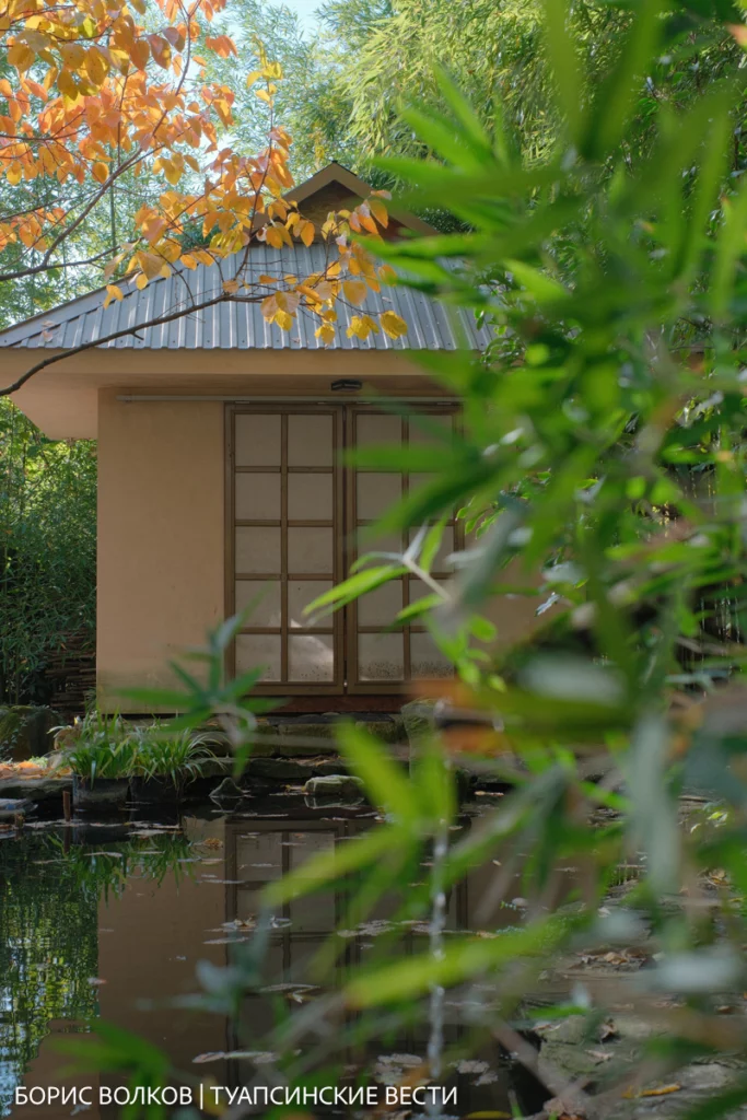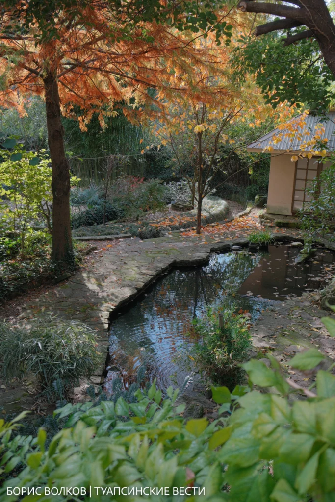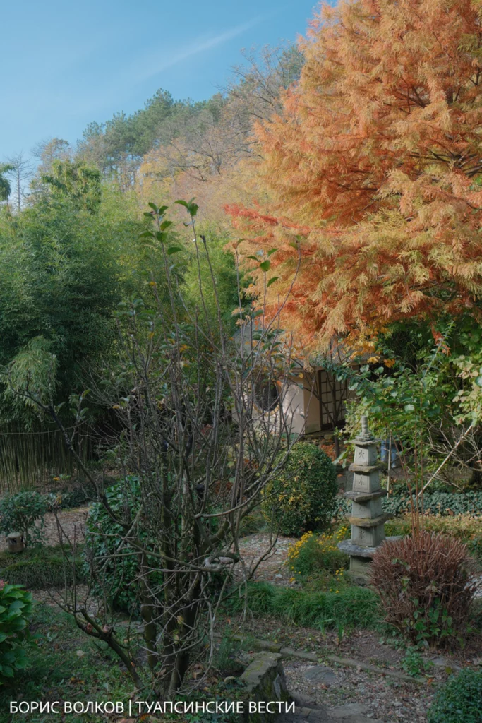 Оказалось, что природа Туапсинского района удивительно близка к японской. Поэтому здесь уживаются и бамбук (его шесть видов), и камфорное дерево, и азимина, и даже болотный кипарис, которому уже 25 лет. Осенью он краснеет, будто вспыхивает изнутри — и сад дышит огнём.
