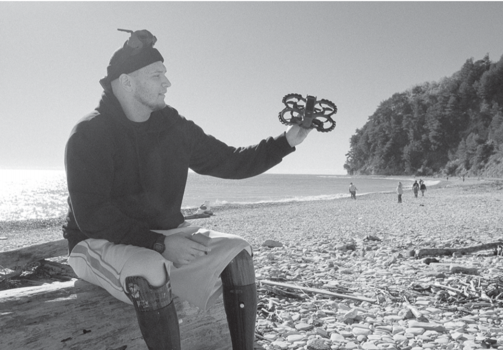 Всё это он мне рассказывает, пока мы на пляже готовимся к съёмке. Чтобы лучше понимать тонкости профессии оператора БПЛА и нарабатывать опыт, Гоша купил себе дрон. Не такой серьёзный, как на курсах, конечно. Его малютка-беспилотник похож на персонажа диснеевских мультфильмов. Для фотографий мы совсем ненадолго поднимаем его в воздух буквально на метр. Он жалобно жужжит, сопротивляясь сильному ветру, и мне в какой-то момент становится его даже жалко. Пока наш фотокорреспондент делает снимки с разных ракурсов, я наблюдаю за тем, как Гоша уверенно управляет дроном. Делает это он с помощью специальных очков и джойстика.