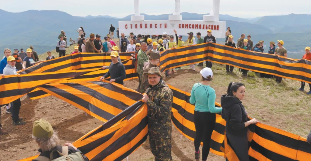 На самом верху, на куполе Се- машхо у мемориала «Стойкости комсомольской» сотрудники Туапсинского НПЗ развернули огромные георгиевские ленты в форме цифры «80» в честь юбилея Победы в Великой Отечественной войне.