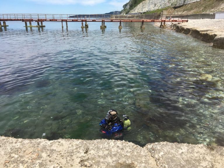 Водолазы спасательной службы проводят обследование дна акватории пляжей на расстоянии 50 метров от береговой полосы, чтобы обеспечить купающимся безопасность.