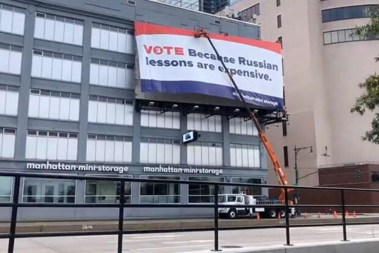 Баннер "Голосуй, потому что уроки русского языка дорогие", вывешенный на здании в Нью-Йорке, разозлил американцев советского происхождения.