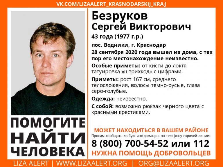 Он мог иметь при себе рюкзак черного цвета с красными крестиками. Во что был одет, не известно, пишет «Кубань 24».