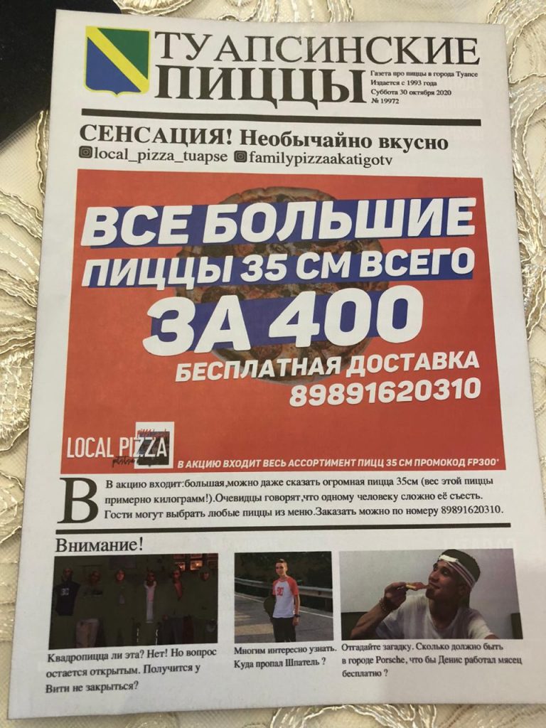 Неоднозначный рекламный ход сделала одна из пиццерий города, скопировав дизайн первой полосы "районки".