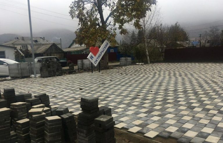 Тротуарная плитка в центре горного поселка уже практически уложена.