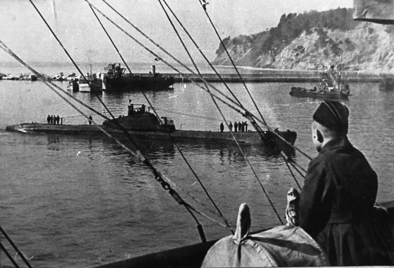 Советская подводная лодка Щ-208 входит в порт Туапсе