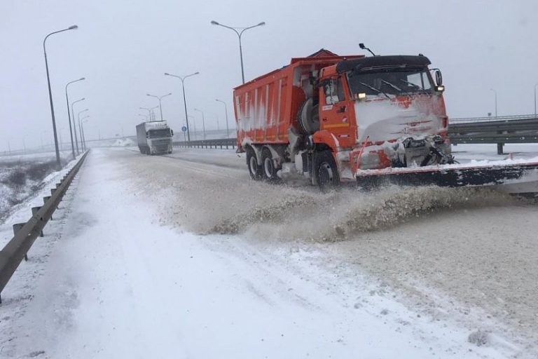 По его словам, из-за налипания мокрого снега, ФКУ Упрдор «Тамань» принято решение о временном перекрытии Крымского моста и начале работ по очистке дорожного полотна.
