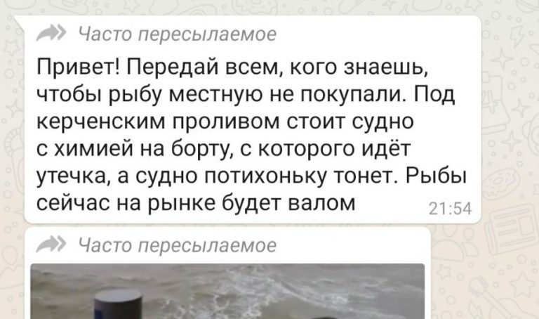 «Передайте всем, кого знаете, чтобы местную рыбу не покупали. В Керченском проливе стоит судно с химией на борту, с которого идет утечка» — пишется в наиболее часто пересылаемом сообщении (как отмечает система).