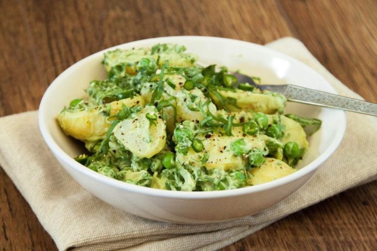 Надо отварить картофель в мундире, почистить и нарезать крупными кубиками или кружочками. Добавить горошек, немного соли, перца чили. Нарезать черемшу и добавить к картофелю с горошком.