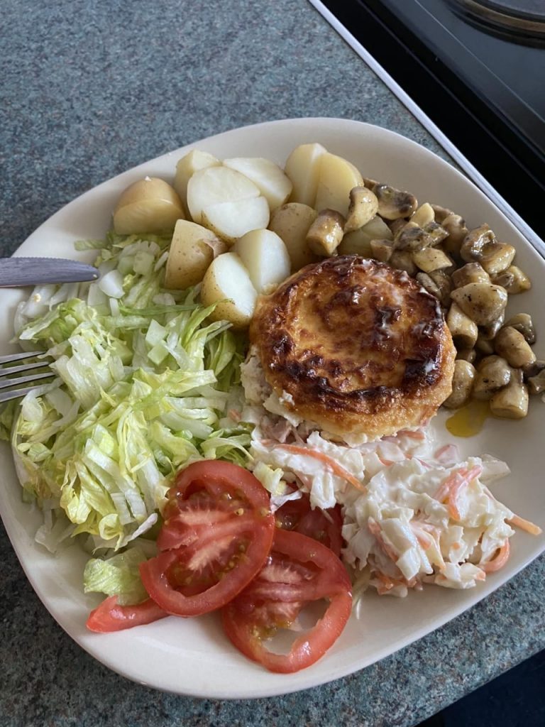 Сегодняшний ужин - английский. В него входят сырный киш с беконом, салат и Коул Слоу, молодой картофель и грибы в сливочном соусе с черным перцем.