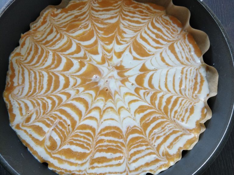 Теперь застилаем дно формы пергаментной бумагой, промазываем сливочным маслом, хотя это не обязательно. Выкладываем два вида «теста» поочередно на середину формы. Две ложки тыквы, две ложки творога, снова две ложки тыквы, две ложки творога. Накладывать надо в центр. Так постепенно образуется «зебра».
