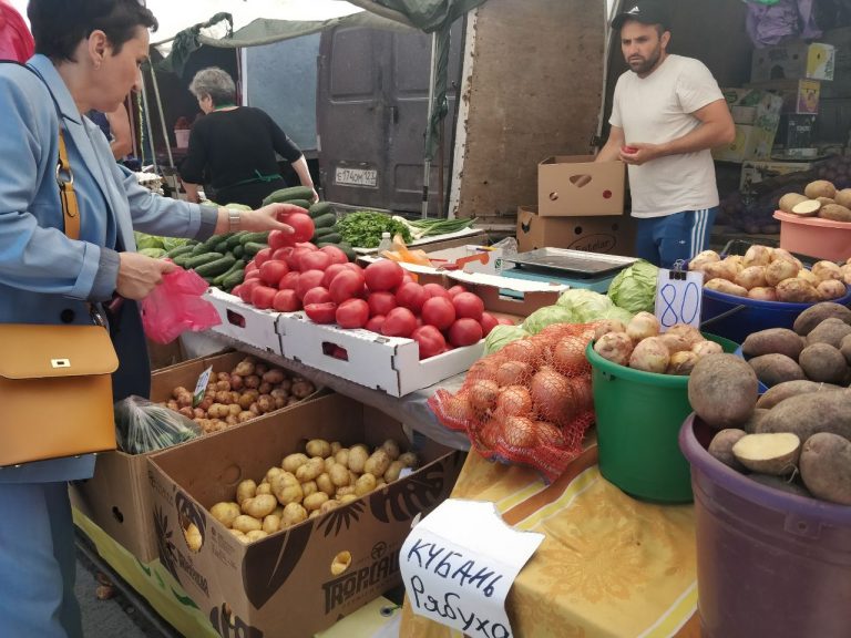 На центральном рынке ближе к вокзалу (так называемый «дальний рынок») и на рынке в центре города (так называемый «муниципальный») цены на все в субботу оказались идентичными ярмарке. Разве, что на «дальнем» рынке молодую капусту можно было купить и по 40 рублей, а помидоры от 100, кривые, но «наши». Клубника — 140-150 рублей.