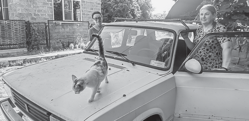Неподалёку от сельской часовни во дворе Альбины бегает ручной козлёнок – рогатый, но ласковый, бережно щиплет за рукав. На лугу рядом – разномастное стадо, привычное к людям. Патриотическая символика здесь уместна и естественна: между клумбами – флаги, старая «четвёрка» окрашена в цвета триколора.