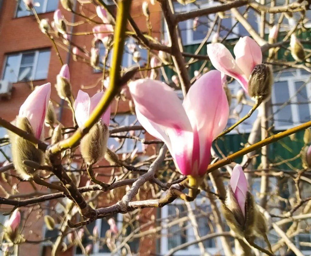 За необычную форму и нежный окрас цветков это дерево ошибочно называют «тюльпановым», однако это – магнолия суланжа, которая начинает цвести только при устойчивом температурном «плюсе»