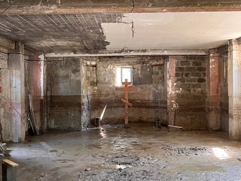 На стенах цокольного этажа храма хорошо видно, насколько высоко стояла вода. А уровень ила, осевшего после наводнения достигал 30 сантиметров